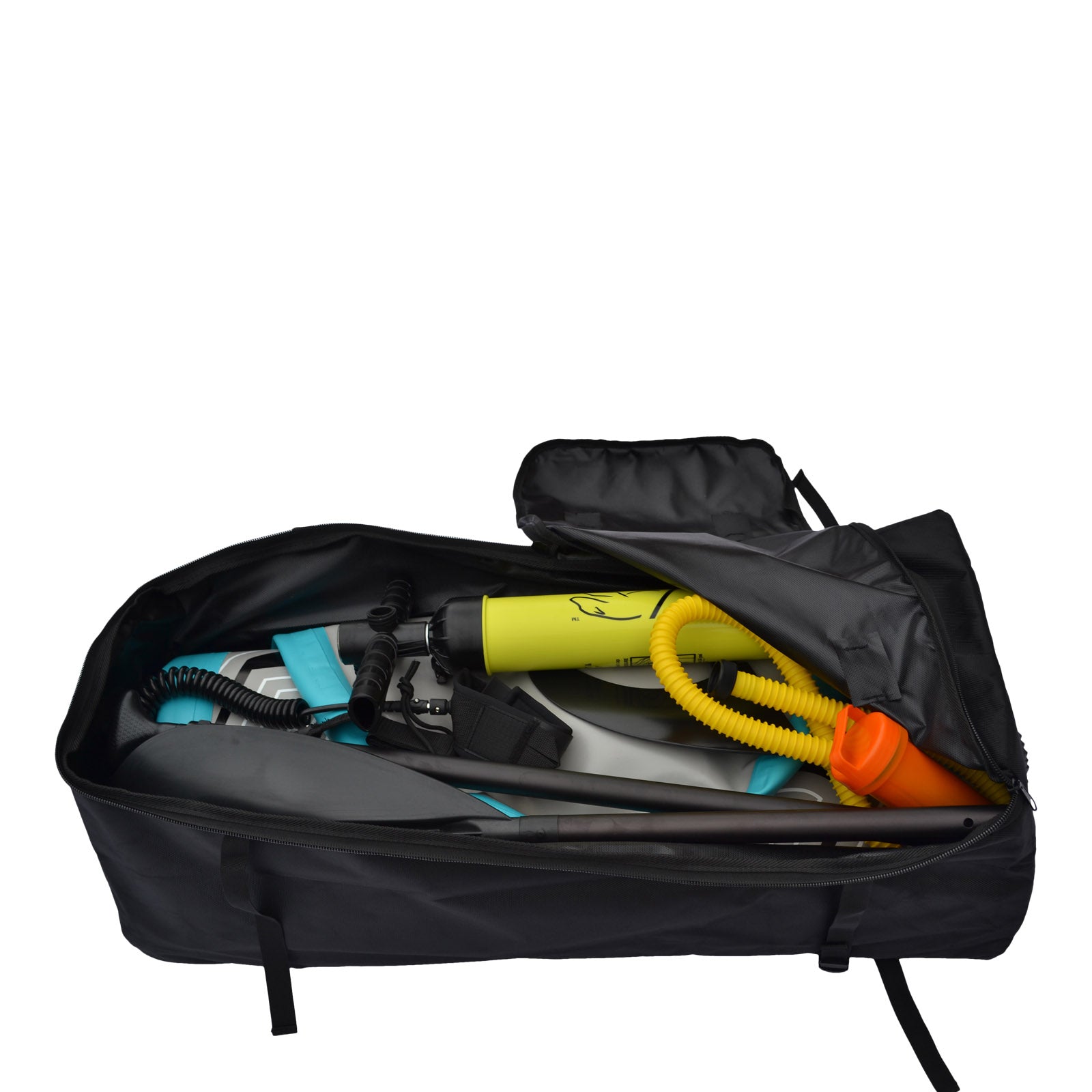 Full package including coiled leash, pump, fins, carry bag and alloy paddle.