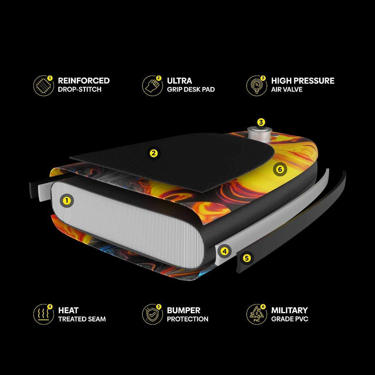 A final layer of double thick PVC to create a bumper effect, resistant to rough terrain minimising puncture damage.