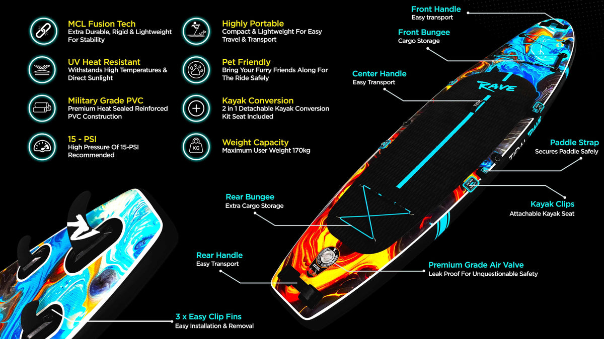 Tidal Rave's triple-layer composite drop-stitch technology makes for a more rigid core, firm density yet lighter board. This allows for a super swift glide on the water surface.