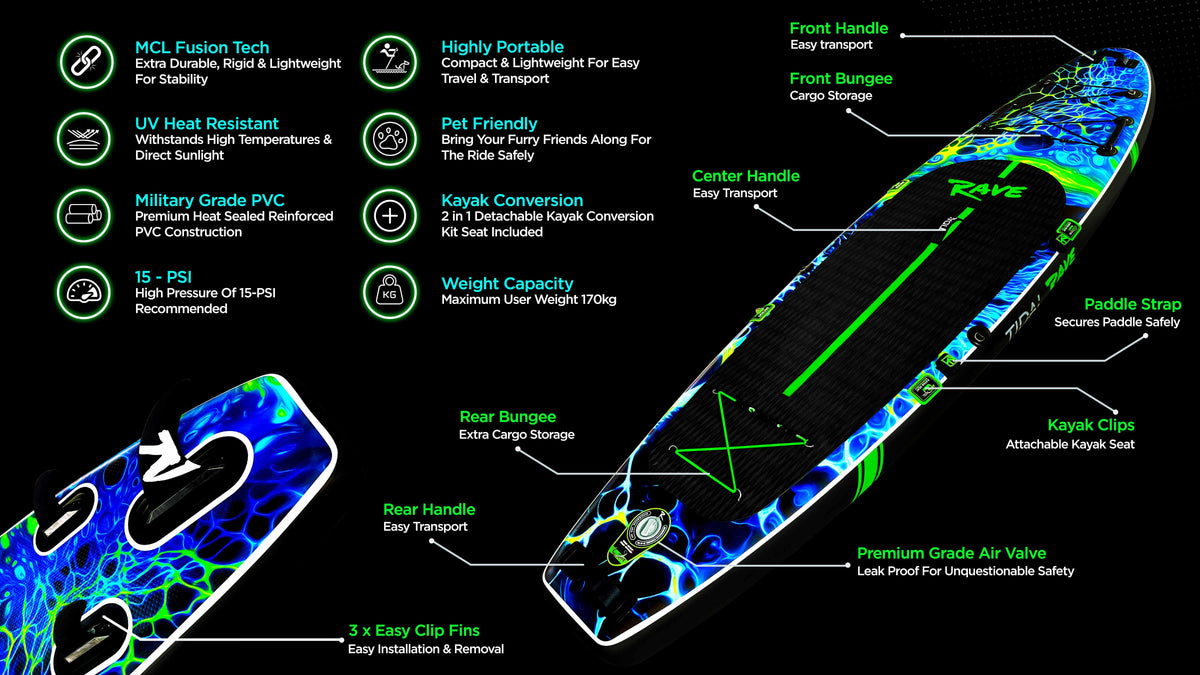 Prepare to capture everyone's attention with the mesmerizing gaze of the Plazma. Step into the limelight and dominate any aquatic setting with Tidal Rave's extraordinary Plazma inflatable paddle board. With its captivating allure, this paddle board stands out from the rest, ensuring that all eyes will be drawn to your magnificent presence.